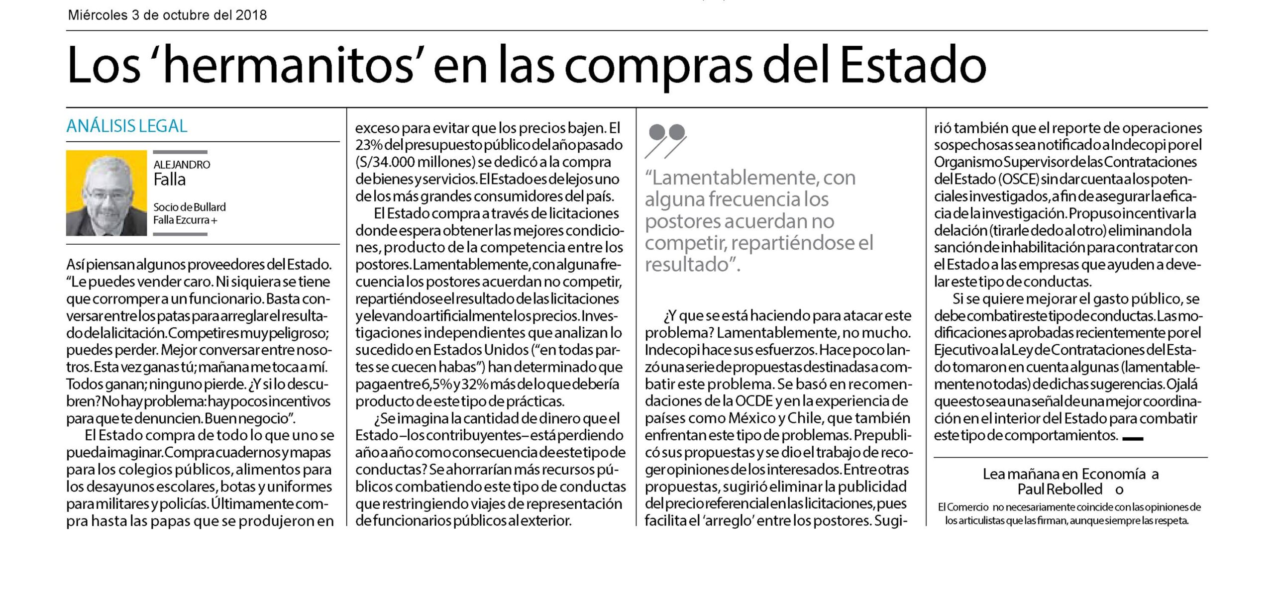 Así piensan algunos proveedores del Estado. “Le puedes vender caro. Ni siquiera se tiene que corromper a un funcionario. Basta conversar entre los patas para arreglar el resultado de la licitación. Competir es muy peligroso; puedes perder. Mejor conversar entre nosotros. Esta vez ganas tú; mañana me toca a mí. Todos ganan; ninguno pierde. ¿Y si lo descubren? No hay problema: hay pocos incentivos para que te denuncien. Buen negocio”….