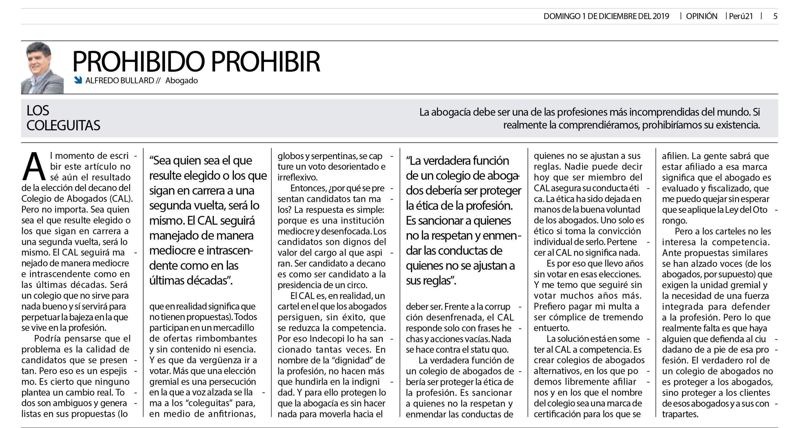 Al momento de escribir este artículo no sé aún el resultado de la elección del decano del Colegio de Abogados (CAL). Pero no importa. Sea quien sea el que resulte elegido o los que sigan en carrera a una segunda vuelta, será lo mismo. El CAL seguirá manejado de manera mediocre e intrascendente como en las últimas décadas. Será un colegio que no sirve para nada bueno y sí servirá para perpetuar la bajeza en la que se vive en la profesión…