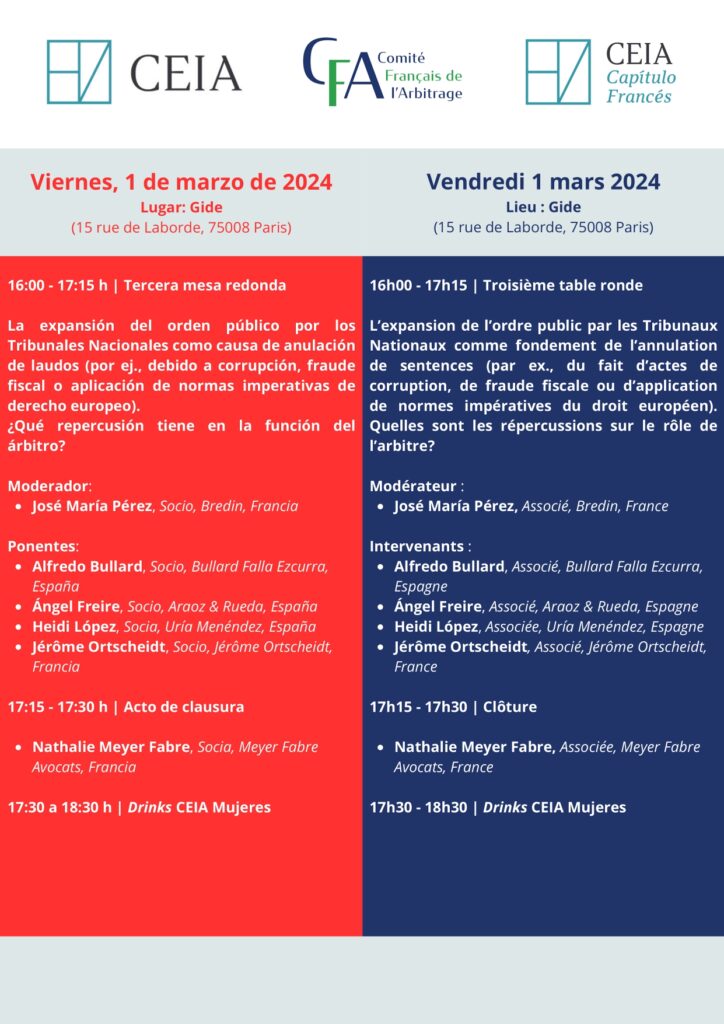 El 29 de febrero y el 1 de marzo de 2024, Alfredo Bullard participó en el evento denominado “XV Miradas Cruzadas franco-españolas. Los árbitros en la encrucijada: entre las exigencias de las partes, los tribunales nacionales y las instituciones arbitrales”, en París.