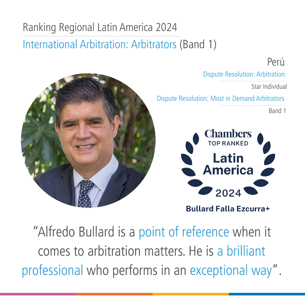 Asimismo, compartimos con ustedes que por primera vez y a partir de esta publicación, Alfredo ha sido destacado como parte del ranking regional Latin America 2024, como el único abogado peruano en la categoría: «International Arbitration: Arbitrators».