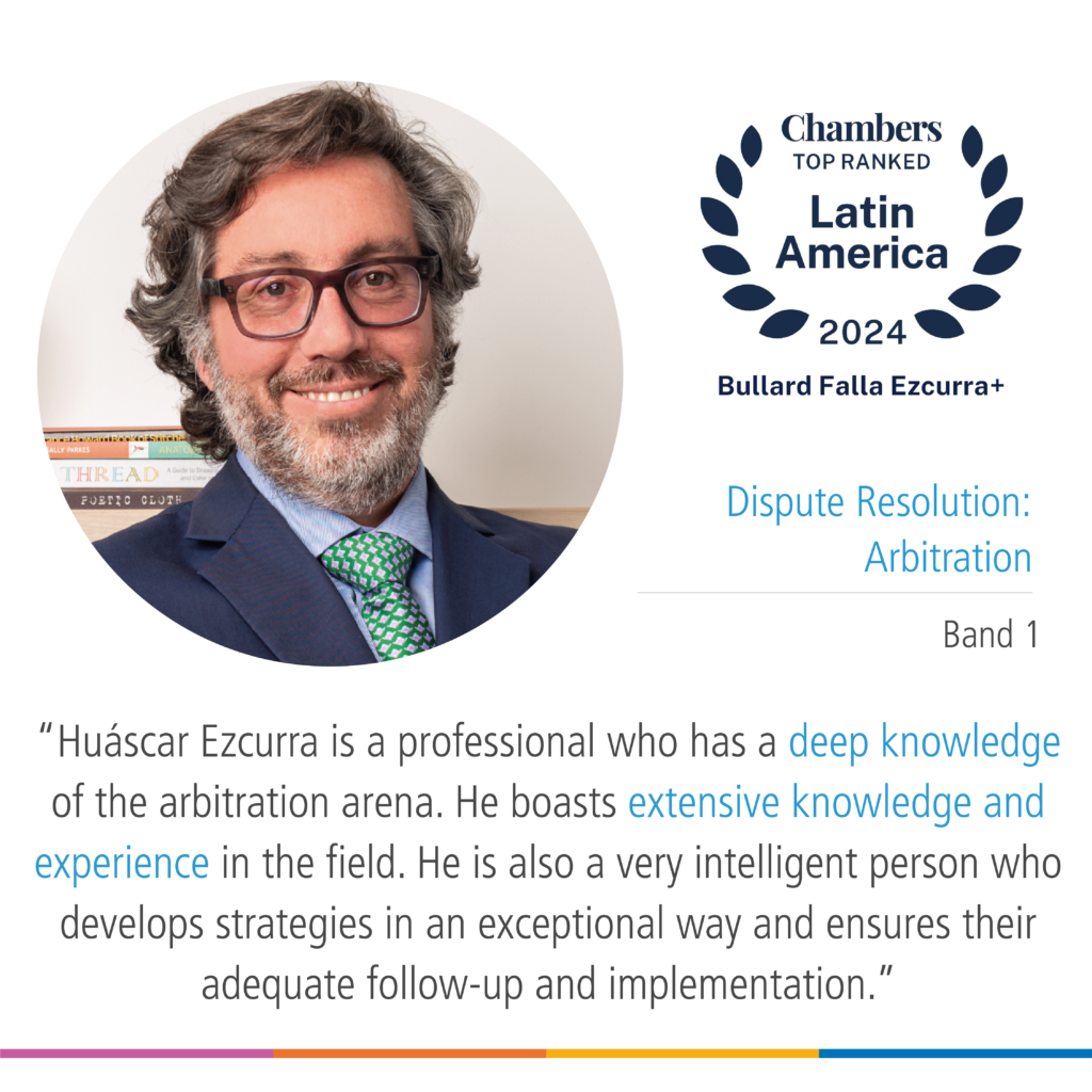 Estamos felices de compartir con ustedes que por décimo sexto año consecutivo seguimos liderando el ranking de Dispute Resolution: Arbitration en la publicación anual que hace Chambers and Partners. Agradecemos el respaldo de nuestros clientes y felicitamos a nuestros Socios Alfredo Bullard y Huascar Ezcurra por guiar al equipo de Solución de Controversias.