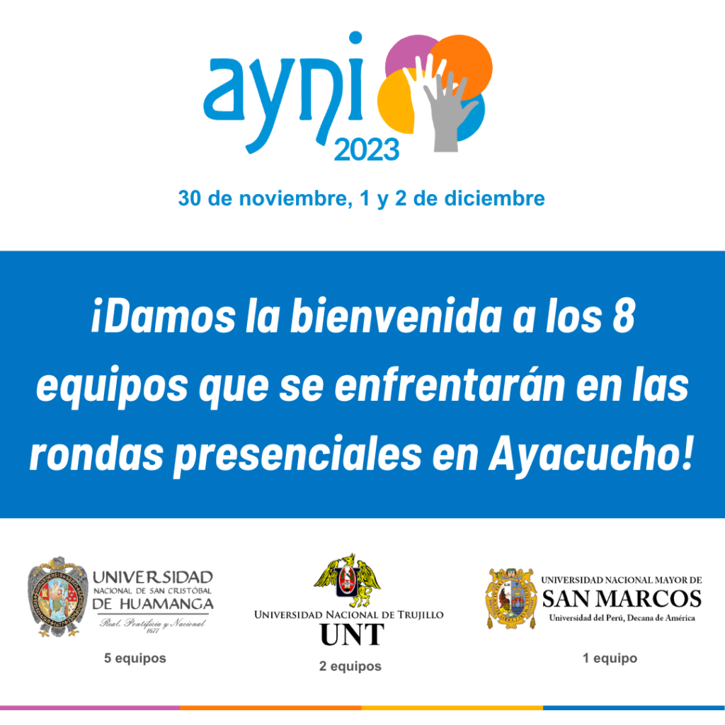 Este 30 de noviembre, 1 y 2 de diciembre, 5 equipos de la Universidad Nacional San Cristóbal de Huamanga, 2 de la Universidad Nacional de Trujillo y 1 de la Universidad Nacional Mayor de San Marcos competirán en el Moot Ayni 2023.