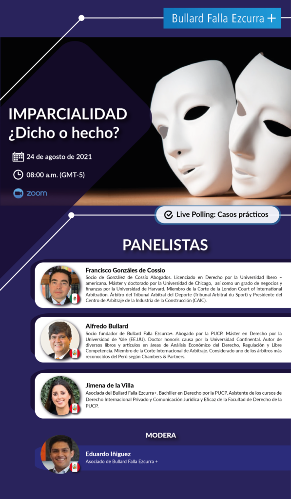 Este 24 de agosto a las 8 am hora de Lima tendrá lugar el evento organizado por Bullard Falla Ezcurra + “Imparcialidad, ¿Dicho o hecho?”, en el que participará el árbitro internacional Francisco González de Cossío. De parte del estudio Bullard Falla Ezcurra +, participará nuestro socio Alfredo Bullard y nuestros asociados Jimena De la Villa y Eduardo Iñiguez.
