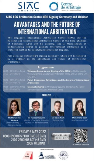 El próximo 6 de mayo, nuestro socio, Huáscar Ezcurra, participará en el webinar “Advantages and the future of International Arbitration”, organizado por el Centro de Arbitraje CCL y el SIAC Arbitration Center.