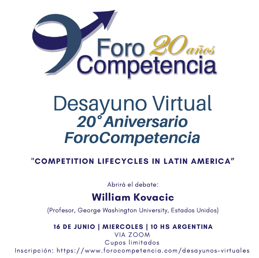 ForoCompetencia invita al próximo desayuno virtual que tendrá lugar el miércoles 16 de junio a las 10:00am, hora de Argentina, con ocasión de su 20° aniversario.