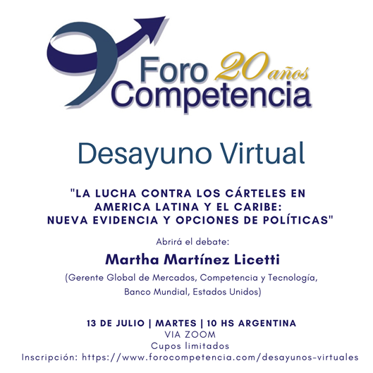 ForoCompetencia invita a su próximo desayuno virtual que tendrá lugar el martes 13 de julio a las 10:00am, hora de Argentina.