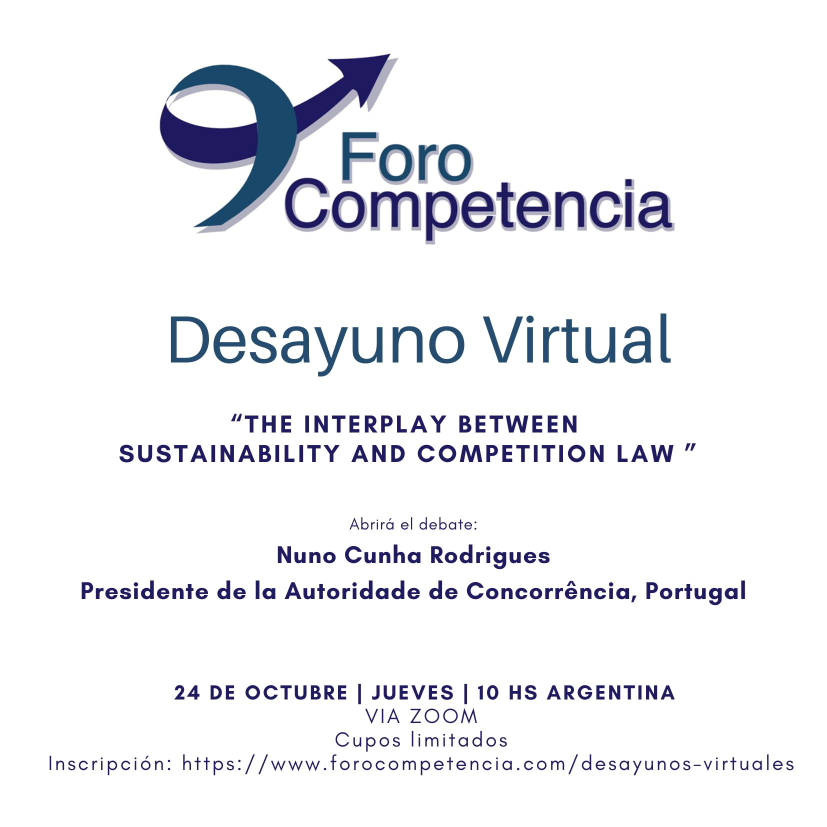 El próximo 24 de octubre a las 10 am (Hora Argentina) se llevará a cabo el desayuno virtual “The interplay between sustainability and competition law». En esta oportunidad, el debate lo abrirá Nuno Cunha Rodrigues (Presidente de la Autoridade de Concorrência, Portugal). Cupos limitados.