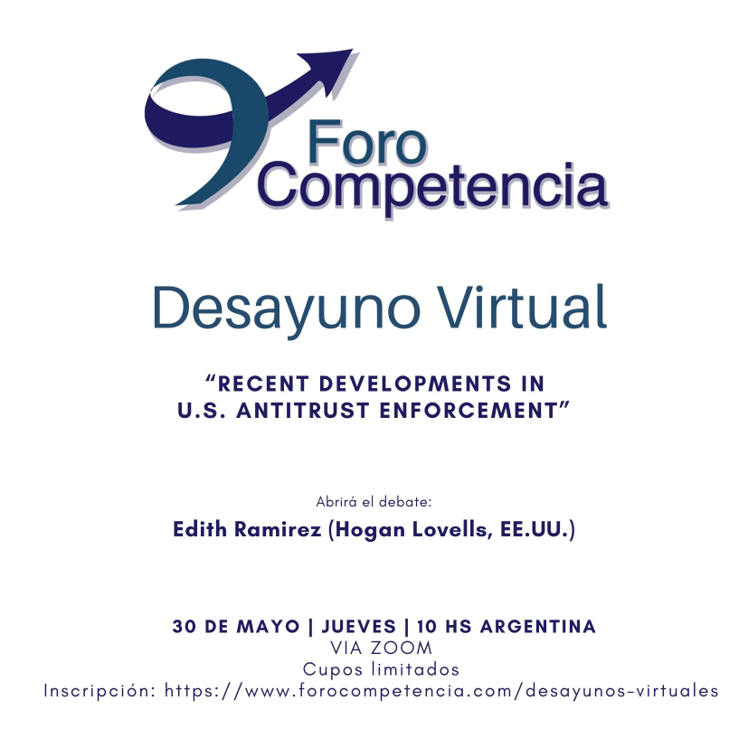 El próximo 30 de mayo a las 10 am (Hora Argentina) se llevará a cabo el desayuno virtual “Recent Developments in US Antitrust Enforcement”. En esta oportunidad, el debate lo abrirá Edith Ramirez (Hogan Lovells, EE. UU). Cupos limitados.
