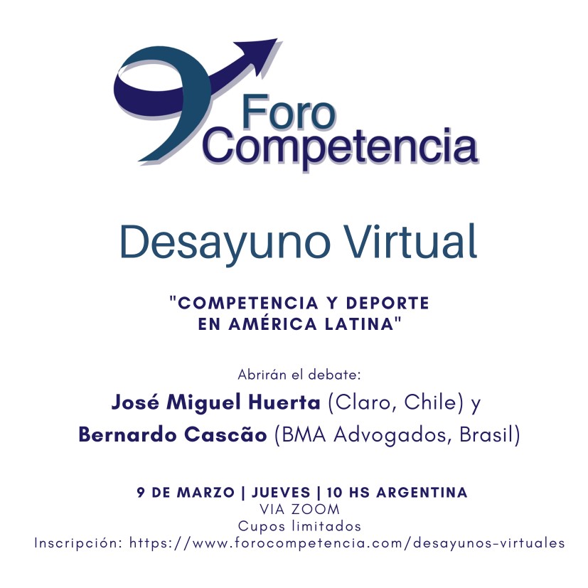ForoCompetencia invita al próximo desayuno virtual: “Competencia y Deporte en América Latina”, que tendrá lugar el jueves 9 de marzo a las 10:00am, hora de Argentina.