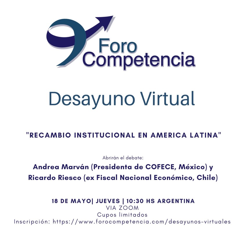 El próximo jueves 18 de abril a las 10:30am (hora de Argentina) se llevará a cabo el Desayuno Virtual ForoCompetencia: “Recambio institucional en América Latina”. El evento contará con Andrea Marván (Presidenta de COFECE, México) y Ricardo Riesco (ex Fiscal Nacional Económico, Chile).