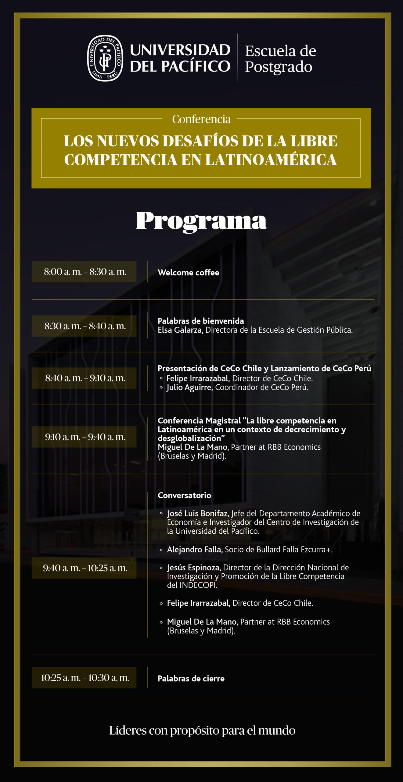 Los invitamos a participar de la conferencia «Los nuevos desafíos de la libre competencia en Latinoamérica» evento organizado por la PBS que contará con la participación de diversos expertos en materia de libre competencia: Felipe Irrarazabal – Directorio CeCo Chile, Julio Aguirre – Coordinador de CeCo Perú, Miguel de la Mano – Partner at RBB Economics (Bruselas y Madrid), José Luis Bonifaz – Jefe del Departamento Académico de Economía e Investigador del Centro de Investigación de la Universidad del Pacífico, Alejandro Falla – Socio de Bullard Falla Ezcurra+ y Jesús Espinoza – Director de la Dirección Nacional de Investigación y Promoción de la Libre Competencia del INDECOPI.