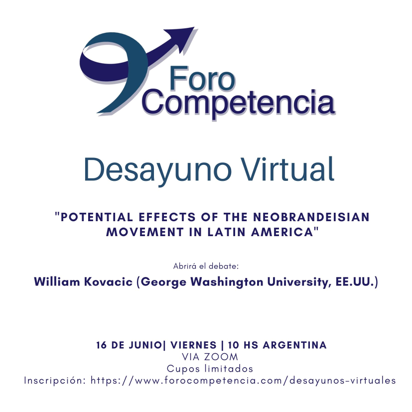 El próximo viernes 16 de junio de 2023 a las 10 am (Hora Argentina) se llevará a cabo el Desayuno Virtual: “Potential Effects of the Neobrandeisian Movement in Latin America”. En esta oportunidad, el debate lo abrirá William Kovavic (EE.UU). Cupos Limitados.