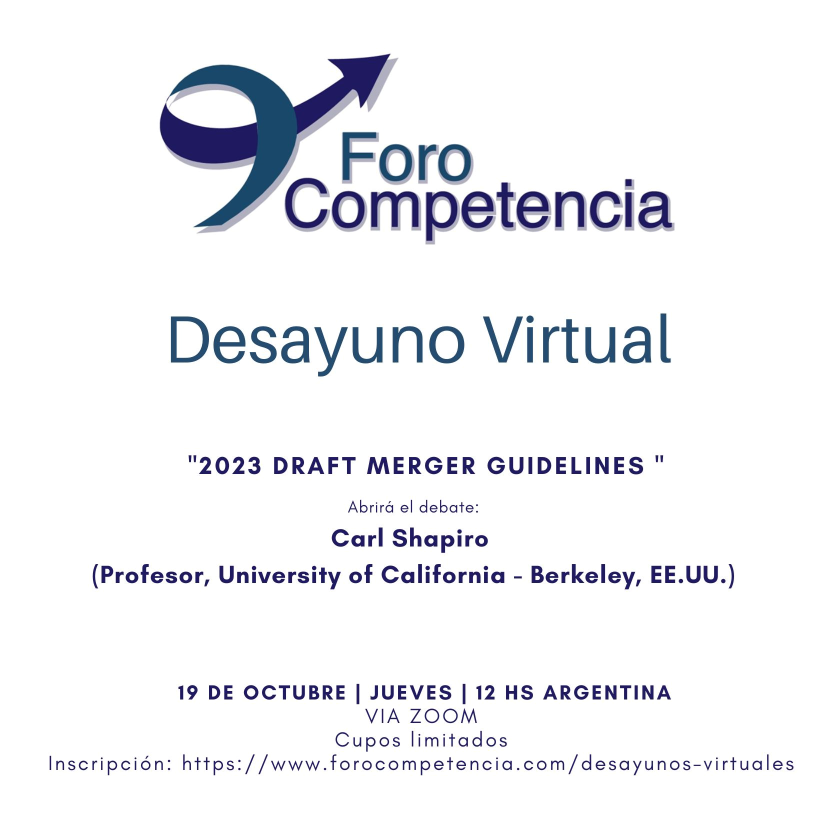 El jueves 19 de octubre a las 12:00 m (hora Argentina) se llevará a cabo el Desayuno Virtual ForoCompetencia. En esta edición, se contará con la participación de Carl Shapiro y el evento girará en torno al Draft Merger Guidelines publicados por el Departamento de Justicia y la Comisión Federal de Comercio de los Estados Unidos.