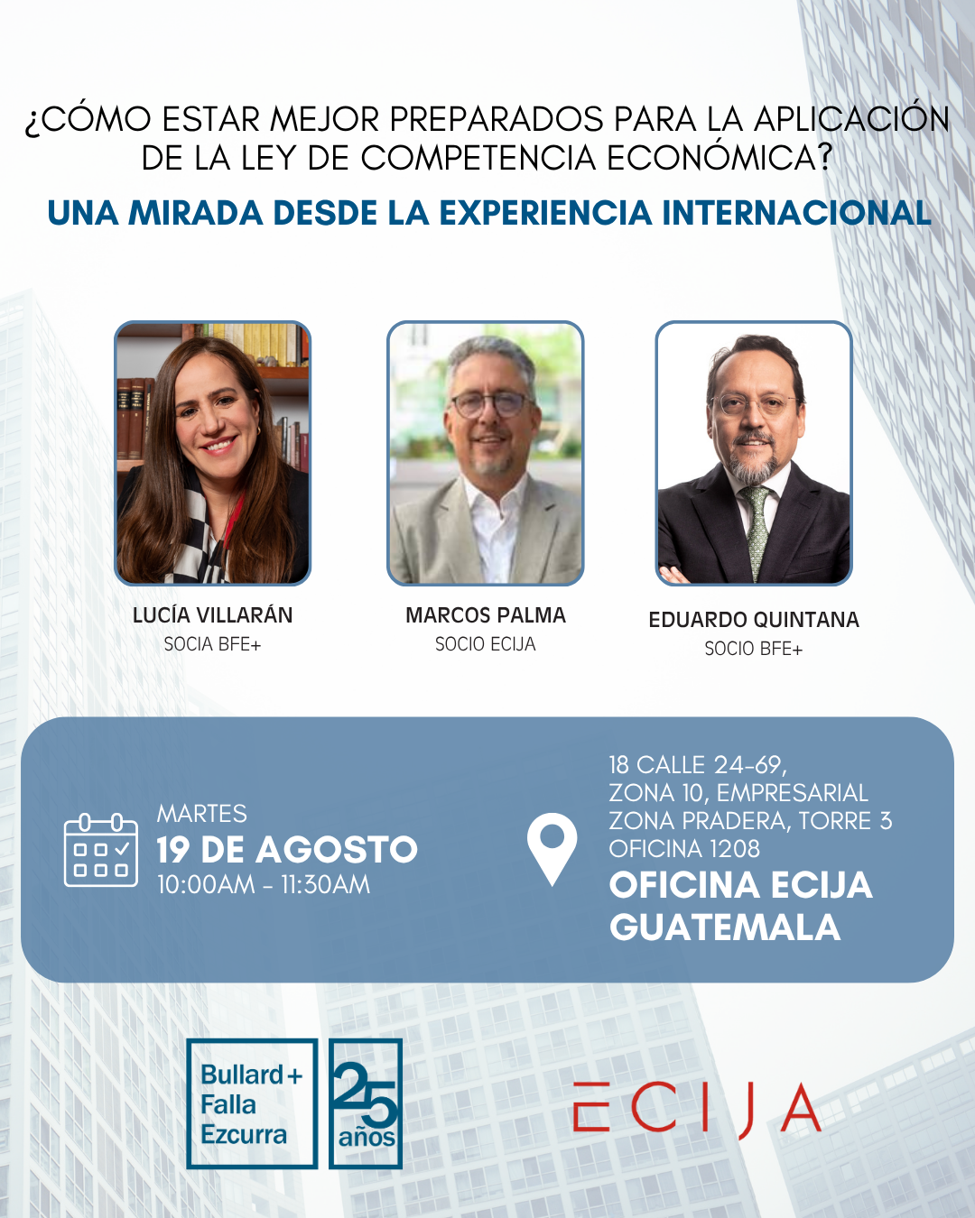 El martes 19 de agosto, a las 10am, realizaremos junto a ECIJA Guatemala el taller: “¿Cómo estar mejor preparado para la aplicación de la ley de competencia?” en el que nuestros socios Eduardo Quintana y Lucia Villarán se reunirán con Marcos Palma, socio de ECIJA, para analizar los principales retos del régimen de competencia con el objetivo de fortalecer el conocimiento en materia y promover mejores prácticas en la región.