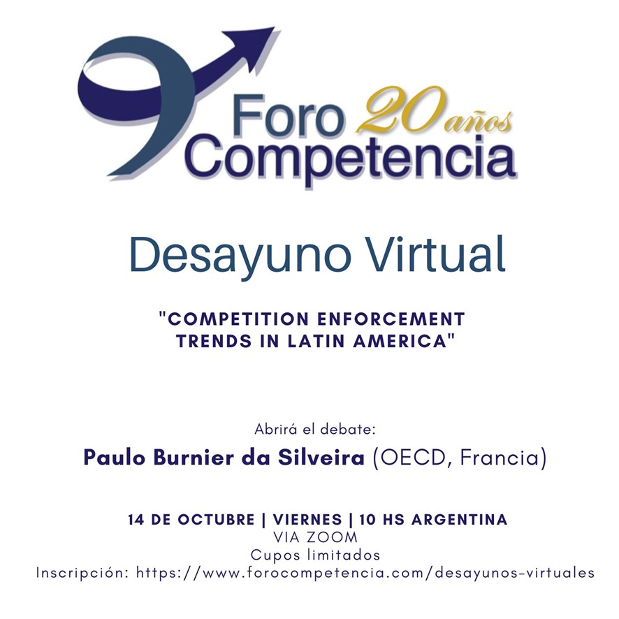 ForoCompetencia invita al próximo desayuno virtual: “Competition enforcement trends in latin america”, que tendrá lugar el viernes 14 de octubre a las 10:00am, hora de Argentina.