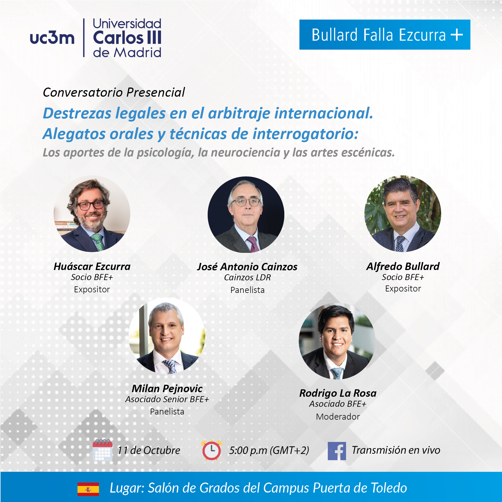 Los invitamos a participar del evento presencial coorganizado con la Universidad Carlos III de Madrid: “Conversatorio. Destrezas legales en el arbitraje internacional. Alegatos orales y técnicas de interrogatorio: los aportes de la psicología, la neurociencia y las artes escénicas”, el próximo martes 11 de octubre a las 5pm hora Madrid / 10 am hora Lima, en el Salón de Grados de la UC3M, Campus Puerta de Toledo. El evento se podrá seguir también de manera virtual. Inscripciones en: https://bit.ly/3C0wDWz
