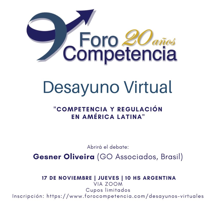 ForoCompetencia invita al próximo desayuno virtual: “Competencia y Regulación en América Latina”, que tendrá lugar el viernes 17 de noviembre a las 10:00am, hora de Argentina.