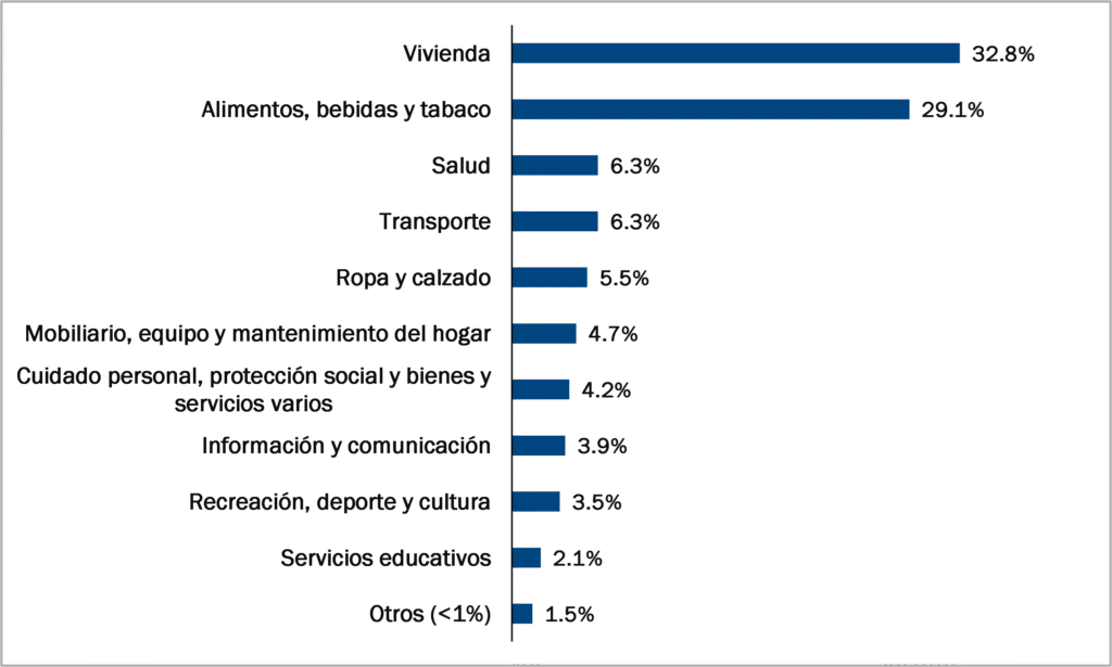 En primer lugar, el criterio relacionado con la importancia en el gasto de los hogares pretende identificar a los sectores que son más sensibles para los hogares, pues cualquier disrupción en la dinámica competitiva que tenga un impacto en precios, tendría un efecto directo en el bienestar de la población. Aplicando este criterio, entre los 10 principales sectores, se identificaron los siguientes como: gastos de vivienda, alimentos, salud, entre otros (ver Figura 1).