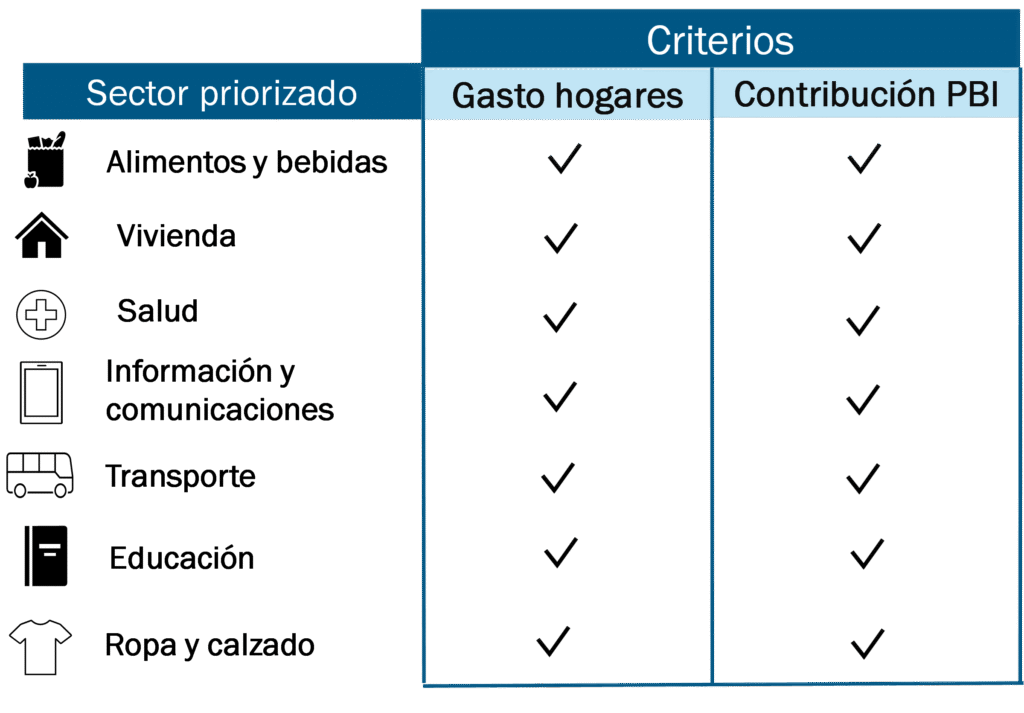 De acuerdo con los dos criterios mencionados anteriormente, los sectores que cumplen ambos requisitos y, por lo tanto, serían seleccionados de manera preliminar son: alimentos; vivienda; salud; información y comunicaciones; transporte; educación; y ropa y calzado4 . (ver Figura 3).