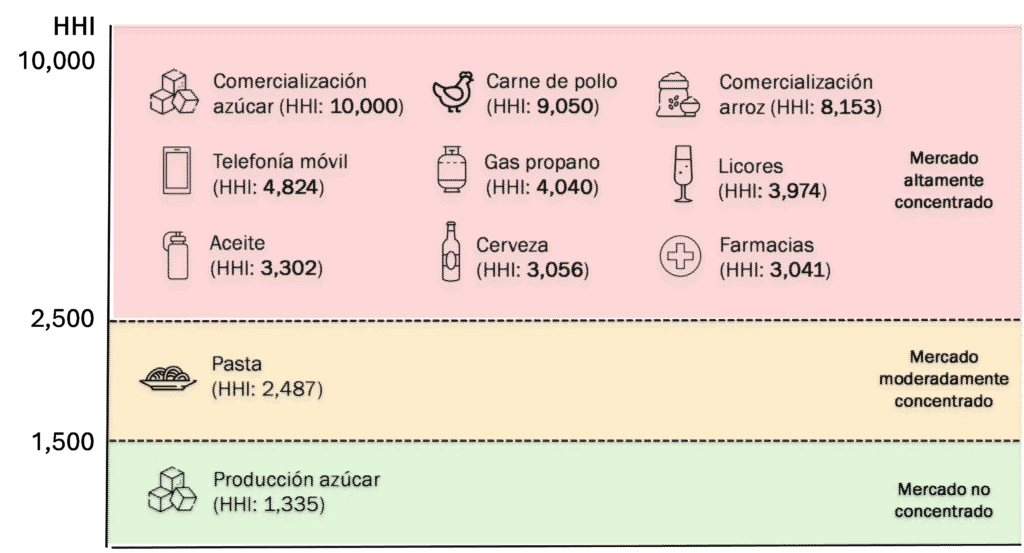 Los elevados niveles de concentración observados en los mercados responden principalmente a la presencia de un número reducido de competidores o a la existencia de agentes con participaciones significativas en el mercado. Por una parte, los mercados de azúcar, telefonía móvil y gas propano albergan una poca cantidad de competidores; por otra, mercados como el arroz y el pollo presentan múltiples participantes, pero pocos concentran las mayores cuotas de mercado.