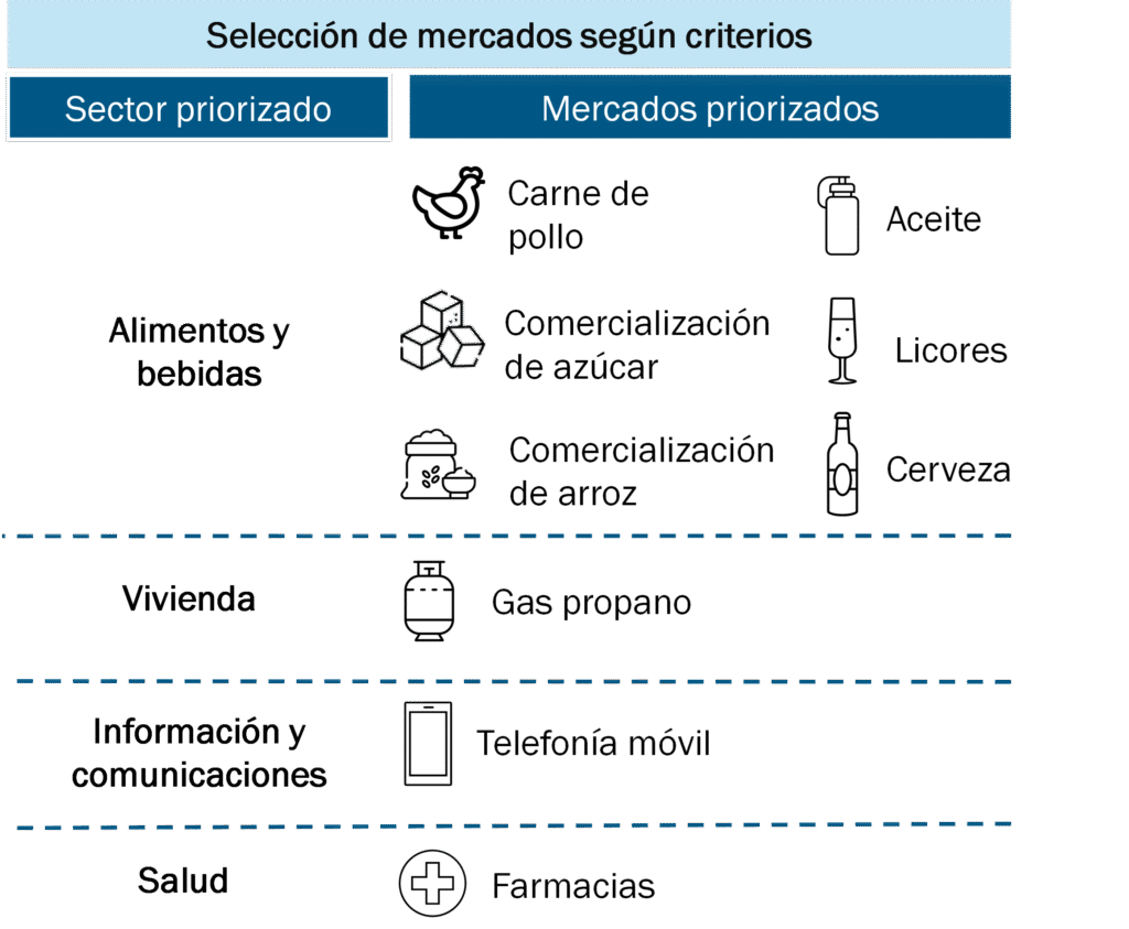 Tomando en cuenta los criterios mencionados anteriormente y considerando la información pública disponible, realizamos un ejercicio de selección de mercados prioritarios de análisis de competencia en Guatemala. Los criterios considerados fueron: (i) contribución significativa al PBI, (ii) representar una proporción significativa del gasto de hogares y (iii) presentar características económicas de mercados concentrados o susceptibles de prácticas colusorias.